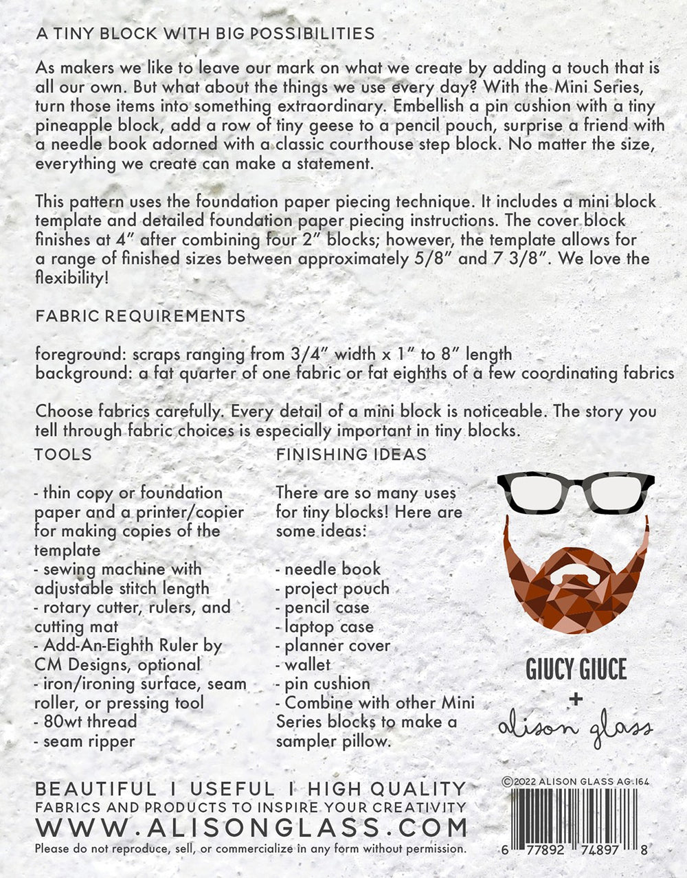With the Mini Series, turn those items into something extraordinary. Embellish a pin cushion with a tiny pineapple block, add a row of tiny geese to a pencil pouch, surprise a friend with a needle book adorned with a classic courthouse step block.