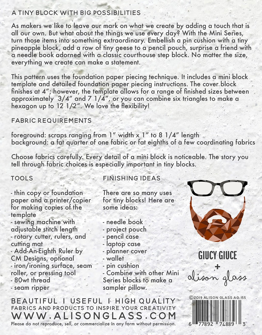 This pattern uses the foundation paper piecing technique.  It includes a mini block template and detailed foundation paper piecing instructions.  The cover block finishes at 4"; however, the template allows for a range of finished sizes between approximately 3/4" and 7 1/4", or you can combine six triangles to make a hexagon up to 12 1/2".  We love the flexibility!