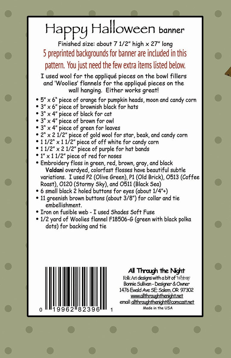 Finished size: about 7-1/2in high x 27in long. Pattern includes 5 pre-printed banner background fabrics.