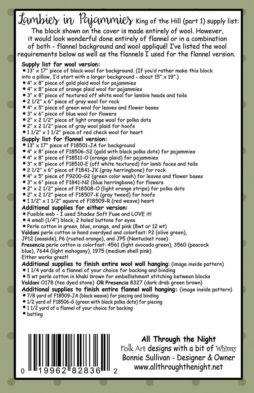 The directions for finishing the wall hanging in wool or flannel can be found in each of the 5 "Lambies in Pajammies" patterns.