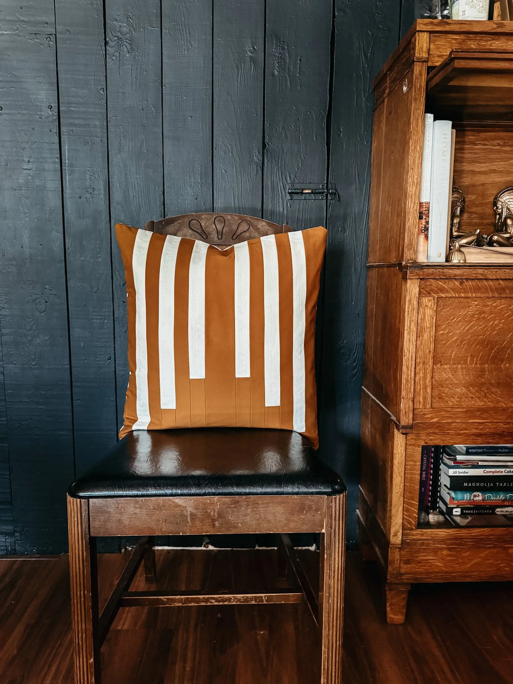 The Cattle Drive Pillow is a modern, patchwork-framed design with crisp strips and a clean envelope back finish. It feels classic yet fresh—just right for tossing on a sofa, gifting to a friend, or adding a handmade touch to your home.
