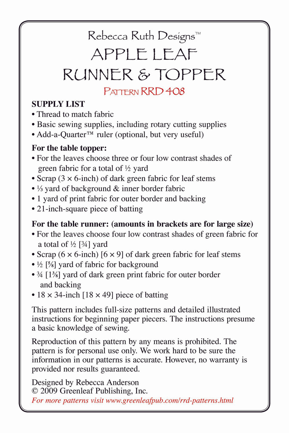 Apple Leaf Runner & Topper Quilt Pattern is backordered and will ship as soon as it is back in stock.