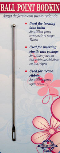 This bodkin can be used for turning bias tubing, inserting elastic into casings, and weaving ribbon.