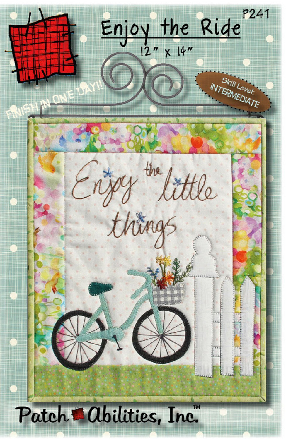 Cotton quilted wall hanging featuring bicycle with flower basket, white picket fence and words of inspiration.