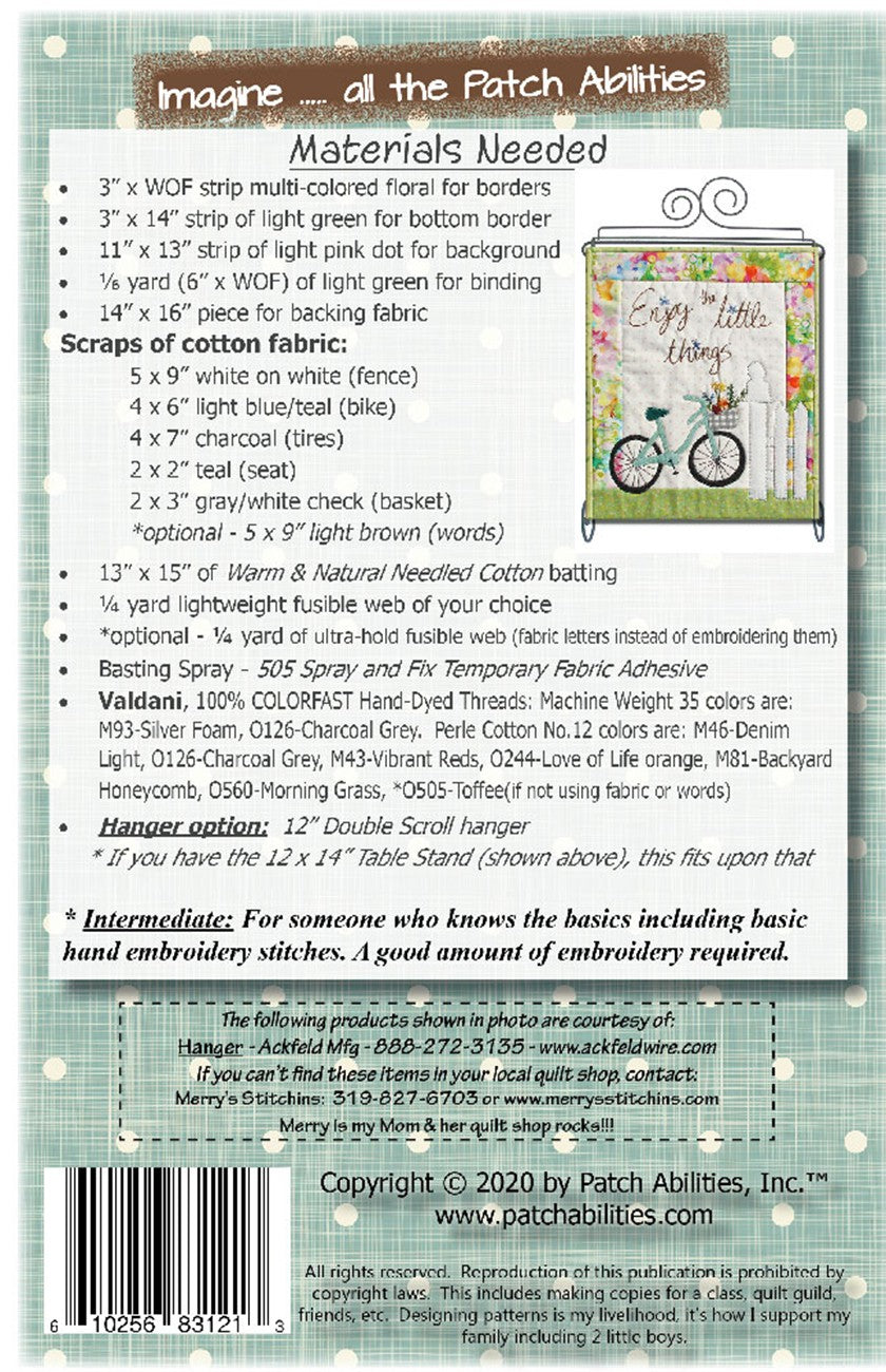 Beginners learning how to piece, use fusible web, machine applique and even bind. Pattern includes beginner tips, hand embroidery figures and complete binding directions. Skill level is Easy with just a smidge of embroidery details to add.