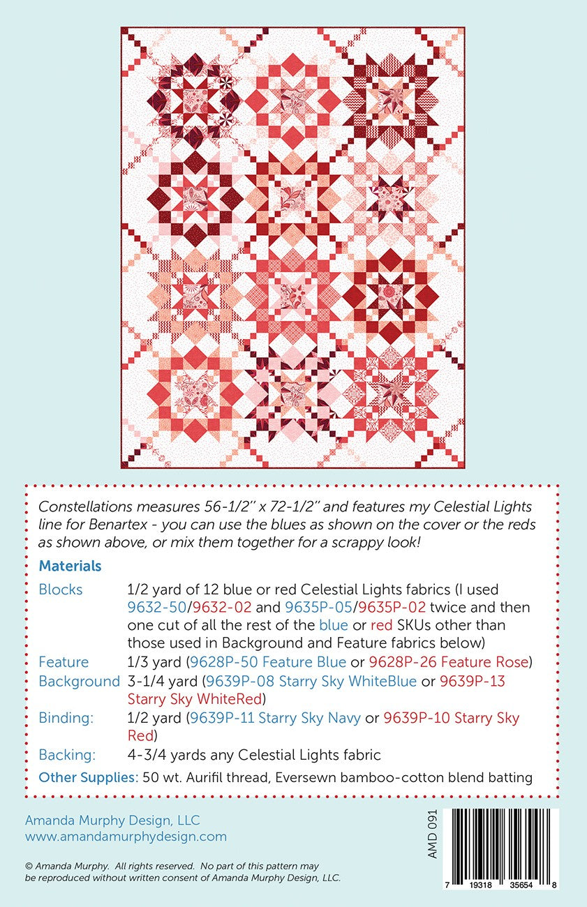 Constellations measures 56-1/2’’ x 72-1/2’’ and features my Celestial Lights line for Benartex - you can use the blues as shown on the cover or the reds as shown on the back, or mix them together for a scrappy look!