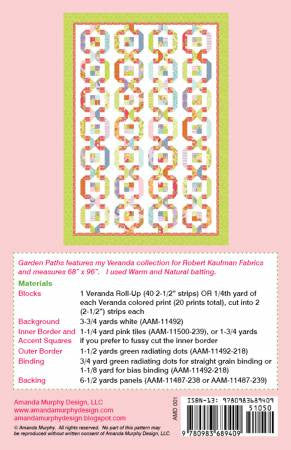 Garden Paths is a full-color roll-up-friendly pattern that is a 2-1/2in strip friendly pattern from Amanda Murphy that features her Veranda collection for Robert Kaufman Fabrics. Finished size is 68in x 96in.