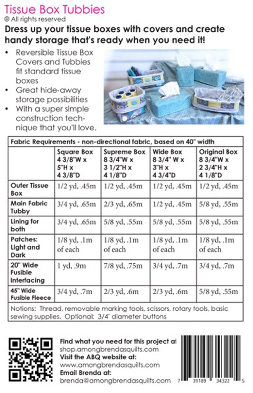 Place the Tissue Box Covers in the Tubbies or separate them when you need storage. Both Covers and Tubbies are reversible. Super-simple construction for fast results. 4 sizes.