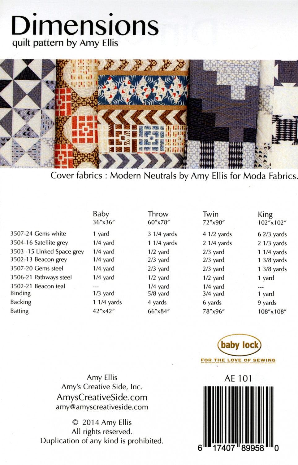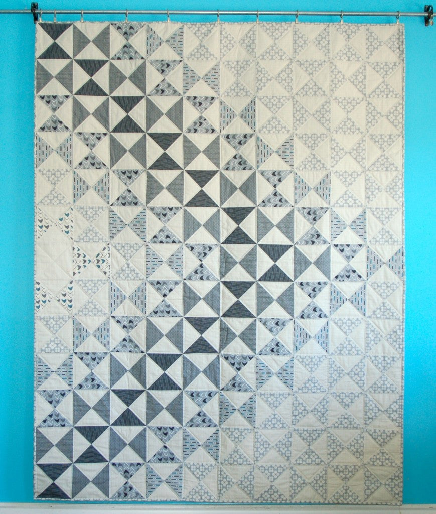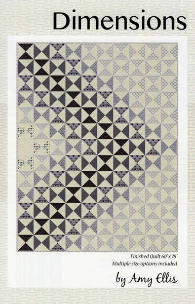 The Dimensions quilt pattern is a lesson in value, or depth of color. Regardless of the color palette you choose to work in, look for subtle variations in your fabrics to fully show off the dimension in your quilt. I love to see the subtle shift in the sophisticated greys, or warm tans, but can easily imagine the quilt made in blues or greens from my stash as well. 60in x 78in