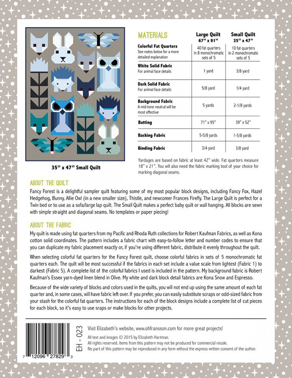 Large 67in x 91in, Small 35in x 47in. Fancy Forest is a delightful sampler quilt featuring some of my most popular block designs, including Fancy Fox, Hazel Hedgehog, Bunny, Allie Owl (in a new smaller size), Thistle, and newcomer Frances Firefly. The 67" x 91" Large Quilt is perfect for a Twin bed or to use as a sofa/large lap quilt. The 35" x 47" Small Quilt makes a perfect baby quilt or wall hanging. All blocks are sewn with simple straight and diagonal seams. No templates or paper piecing!