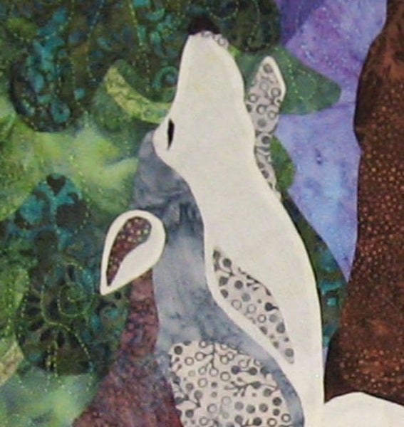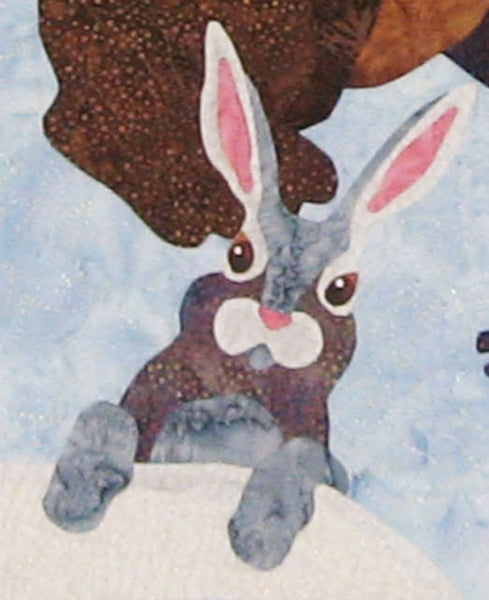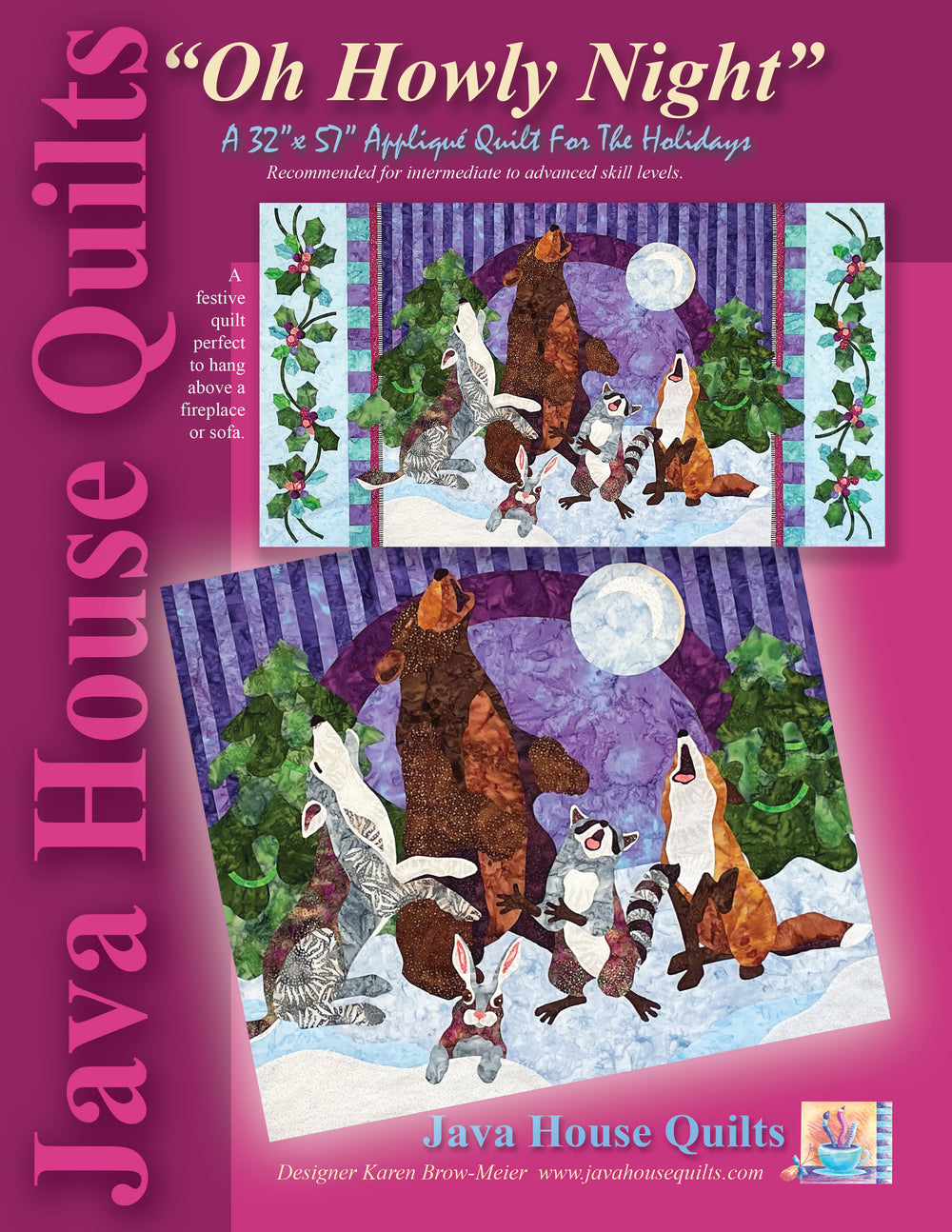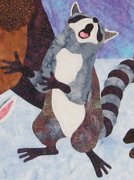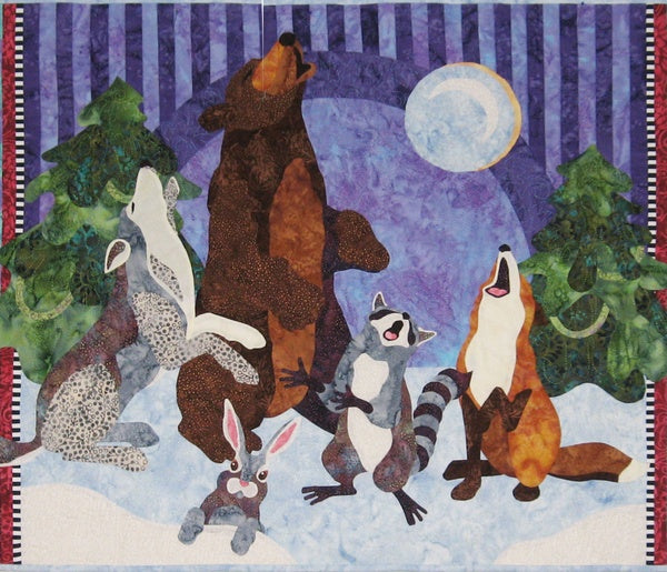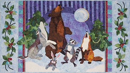 This winter scene features a bear, wolf, raccoon, fox and rabbit singing to the moon, flanked by pine trees. (Full-size applique images are provided.) Beautiful holly vines border the quilt and the pieced background adds a rich night sky.