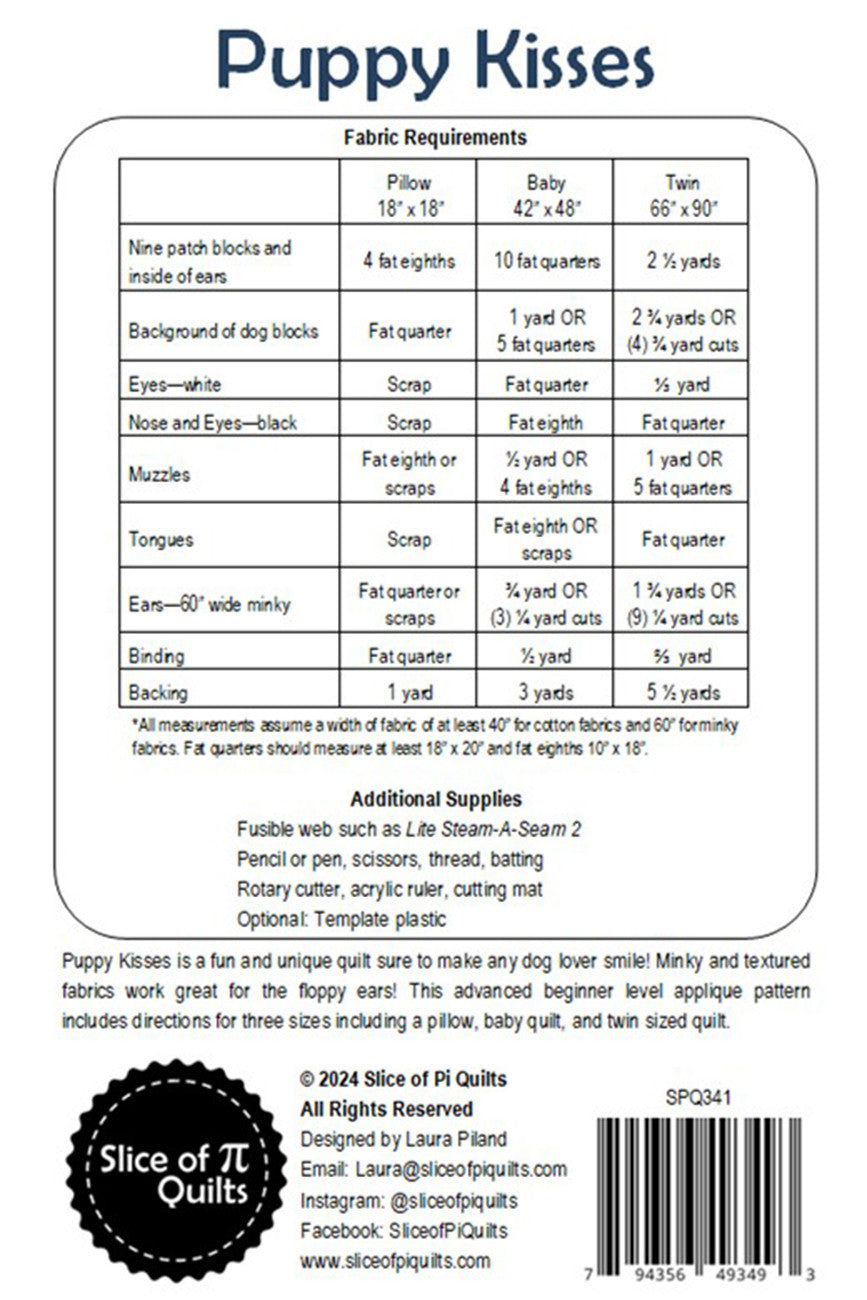 Puppy Kisses is a fun and unique quilt sure to make any dog lover smile! Minky and textured fabrics work great for the floppy ears! This advanced beginner level applique pattern includes directions for three sizes including a pillow, baby quilt, and twin sized quilt.