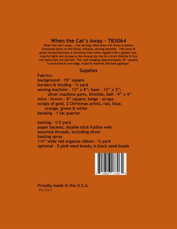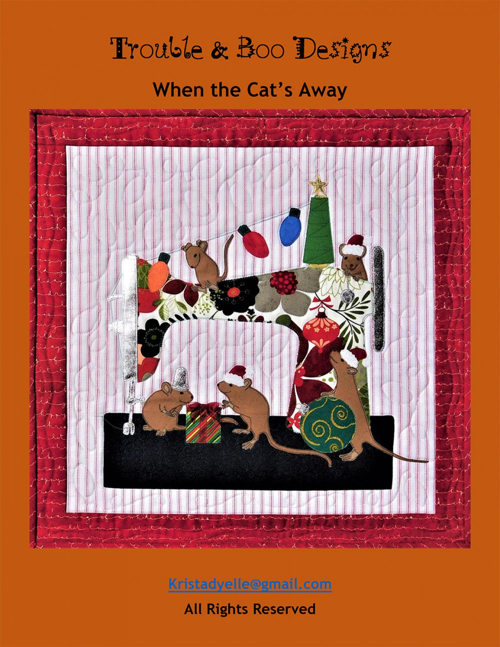 When the cat’s away, the darling, little, brown mice will throw a festive Christmas party on the floral, antique, sewing machine. The cone of green thread becomes a Christmas tree when topped with a golden star, colorful lights are strung on the thread, zip line & a silver thimble & tiny red Santa hats are donned. This wall hanging (approximately 18” square) is executed in raw-edge, fused & machine stitched applique.