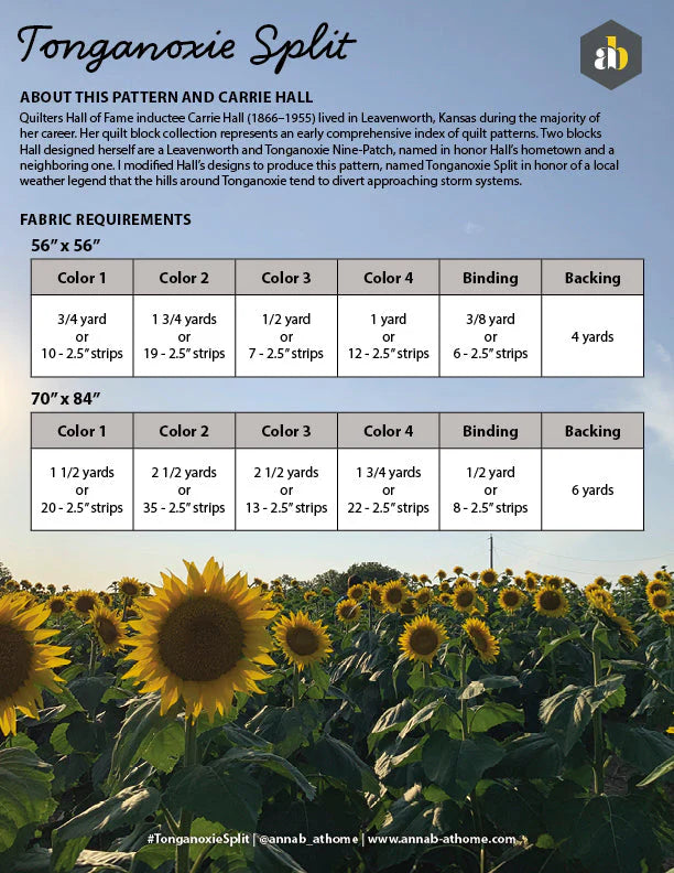 Quilters Hall of Fame inductee Carrie Hall (1866–1955) lived in Leavenworth, Kansas during the majority of her career. Her quilt block collection represents an early comprehensive index of quilt patterns. Two blocks Hall designed herself are a Leavenworth and Tonganoxie Nine-Patch, named in honor Hall’s hometown and a neighboring one. I modified Hall’s designs to produce this pattern, named Tonganoxie Split in honor of a local weather legend that the hills around Tonganoxie tend to divert approaching storm systems.