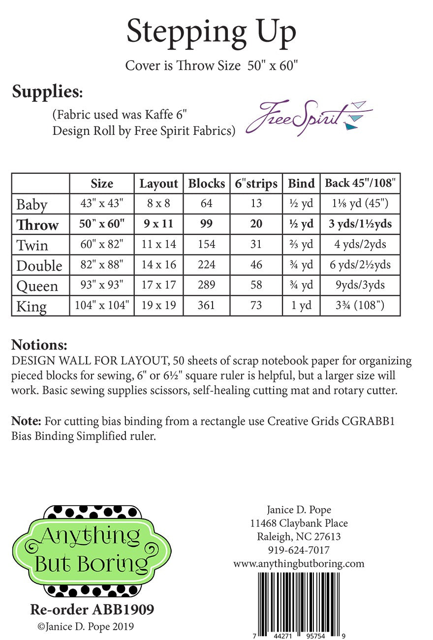 Quilt pattern using 6 inch strip sets in 6 sizes: baby, throw, twin, double, queen, king.