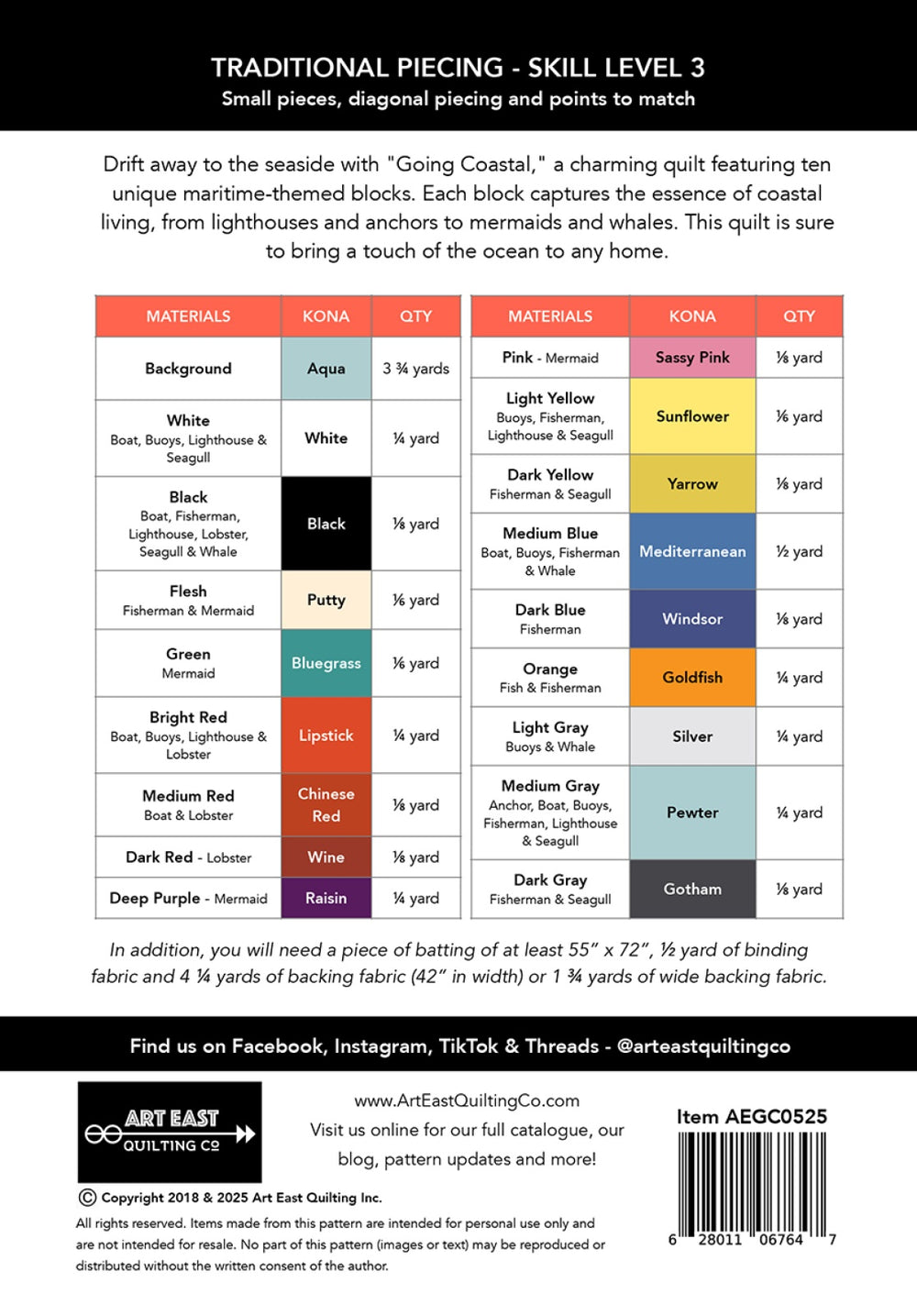 Imagine snuggling under a quilt adorned with whimsical mermaids, iconic lighthouses, playful whales, and bustling fishing boats. The Going Coastal pattern makes it easy to infuse your world with the tranquility and charm of a seaside escape. This comprehensive pattern offers complete instructions to create a stunning 51 x 68 throw quilt that captures the essence of coastal living. Designed for conventional piecing techniques—no paper piecing required—this pattern is accessible for quilters looking to bring a touch of the ocean to their sewing room. Whether you choose to construct the full quilt or use individual blocks for smaller, personalized projects, Going Coastal provides endless creative possibilities. Each charming block is a tribute to marine life and nautical themes, allowing you to craft a unique tapestry of the shore. The individual blocks include: the mermaid (22 ½” x 24 ½” finished) the lighthouse (6” x 19” finished) the anchor block (7” x 10” finished) the buoys block (4” x 24 ½” finished) the fisherman block (15 ¼” x 17 ½” finished) the whale block (20” x 17” finished) the fishing boat block (15” x 10” finished) the fish block (8” x 24 ½” finished) the lobster block (9” x 12 ¼” finished) the seagull block (7 ¼” x 5 ¼” finished)