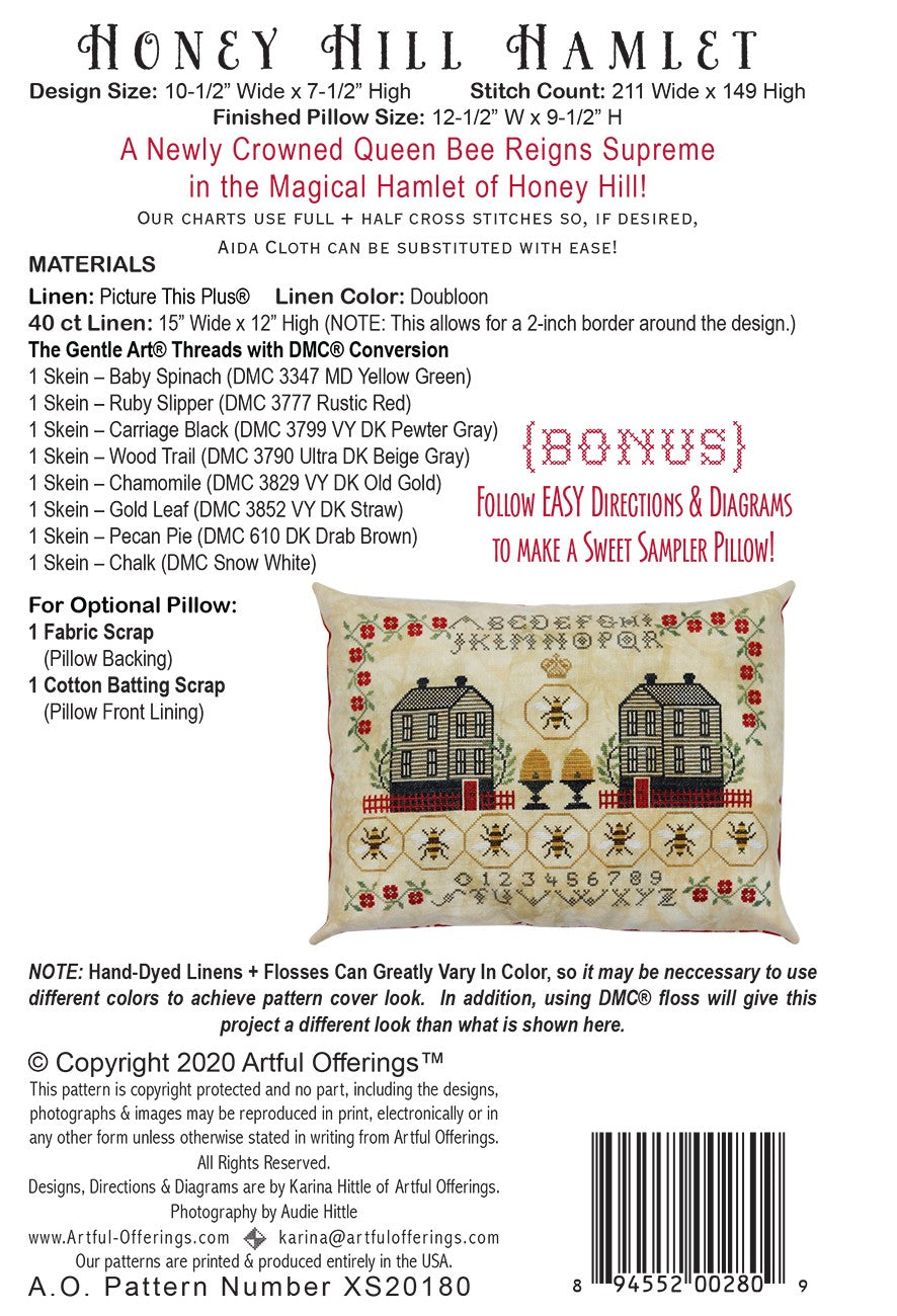 "A newly crowned queen bee holds court in the magical hamlet of Honey Hill. Red picket fences surround a pair of clapboard houses and twin bee skeps mounted on pedestals mark the center of this quaint neighborhood. Honeybees buzz to-and-fro sipping nectar from bordering flowers to craft their golden honeycomb. A unique alphabet and numbers 0-9 complete this sweet sampler!