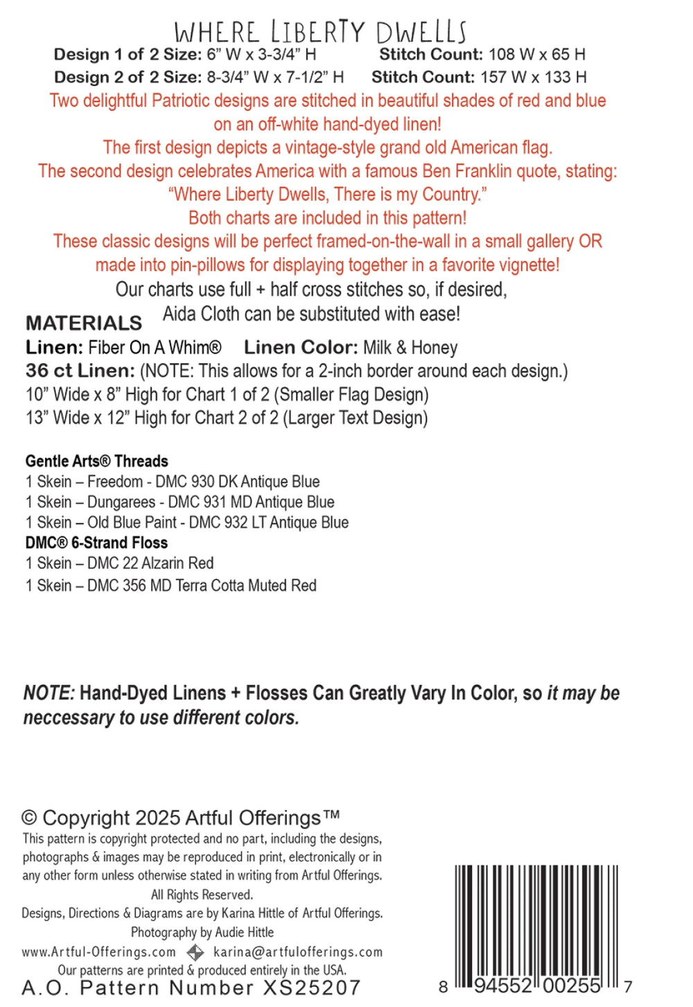 Two delightful Patriotic designs are stitched in beautiful shades of red and blue on an off-white hand-dyed linen!