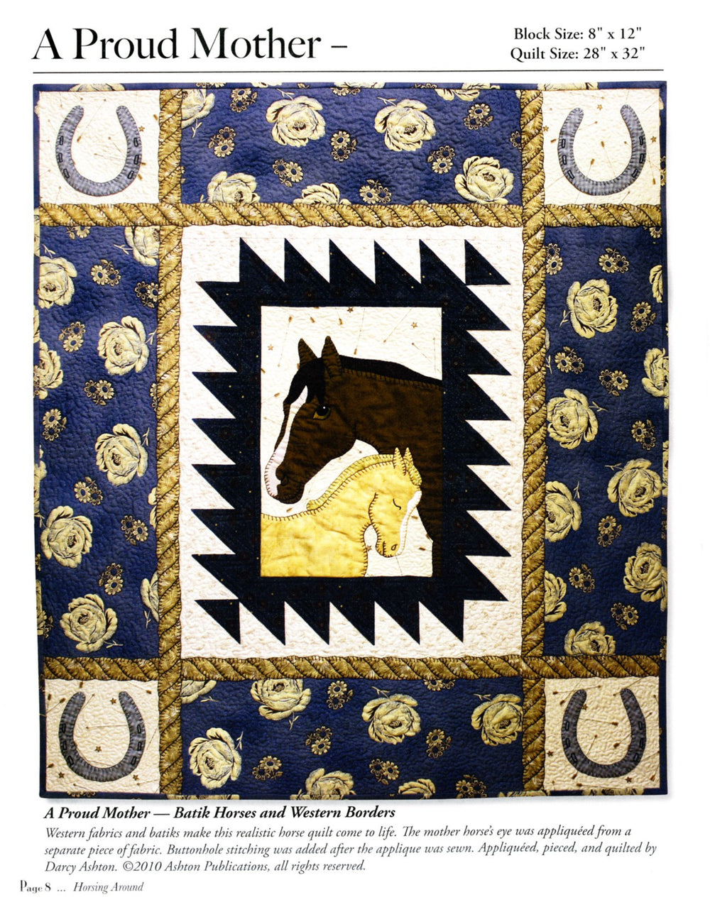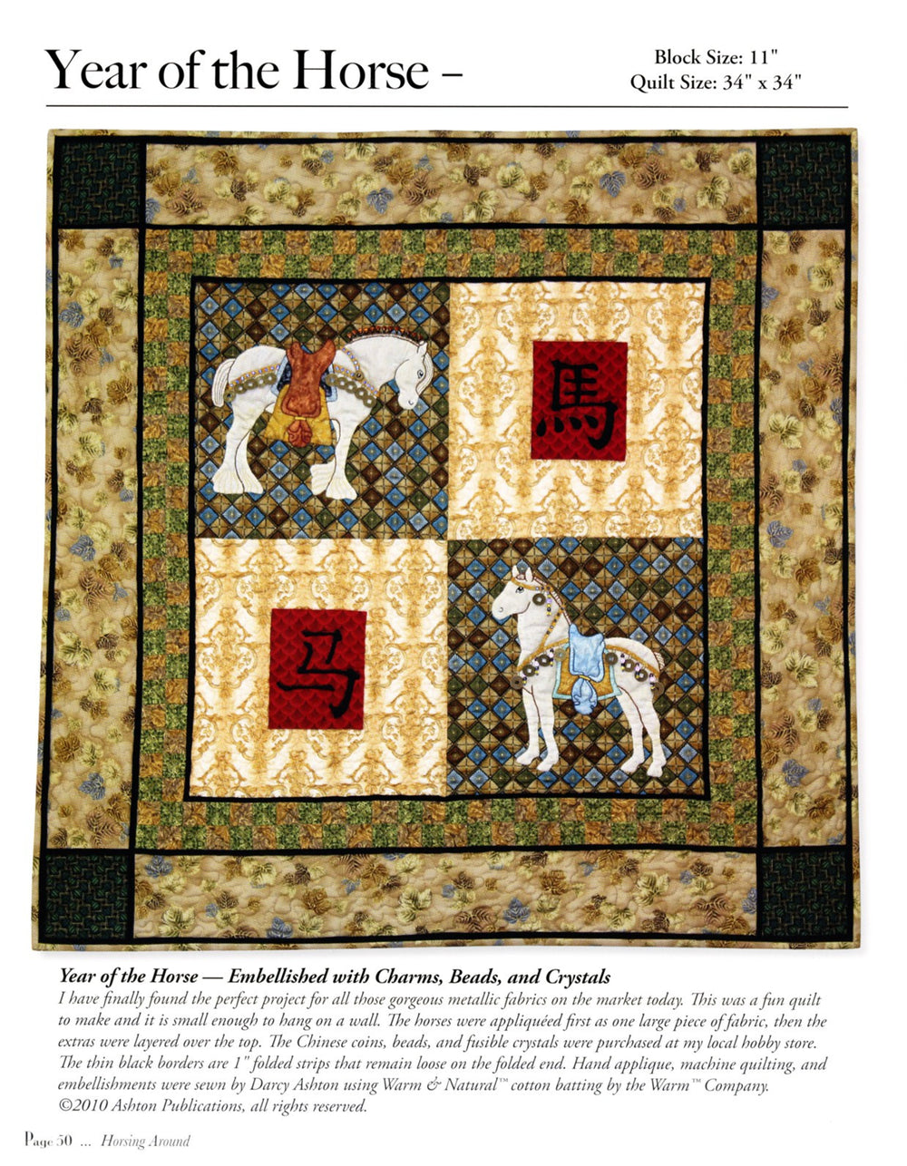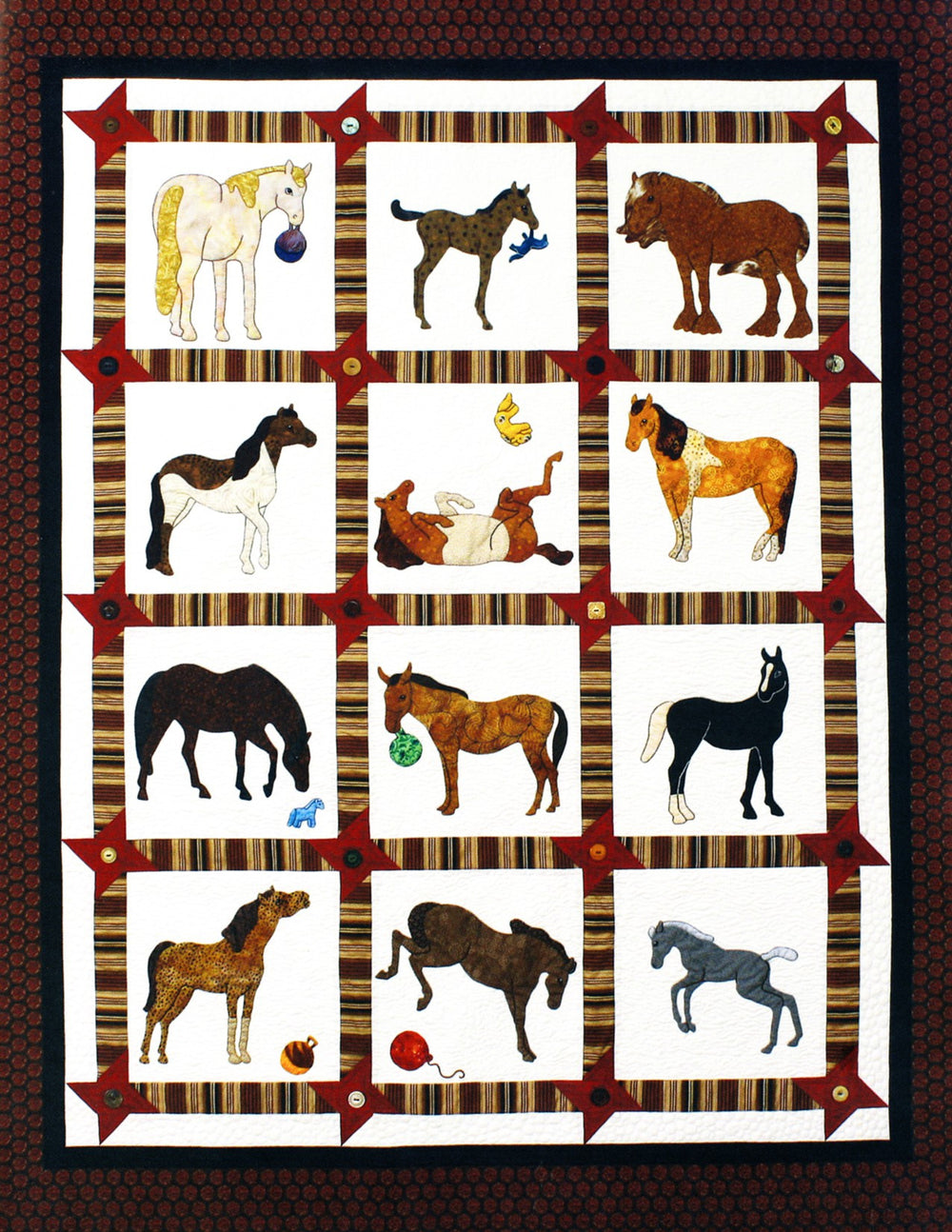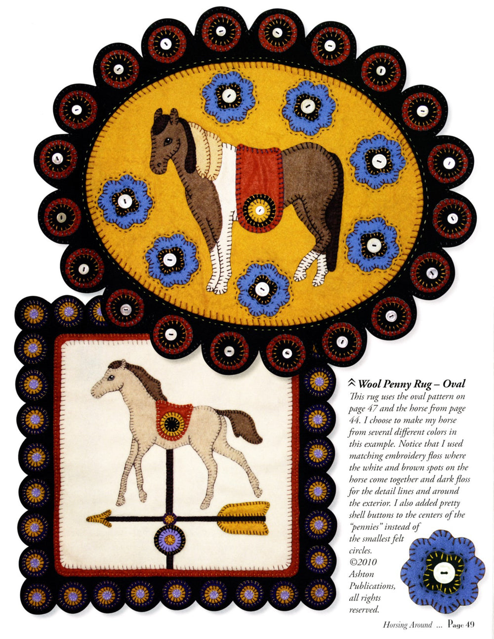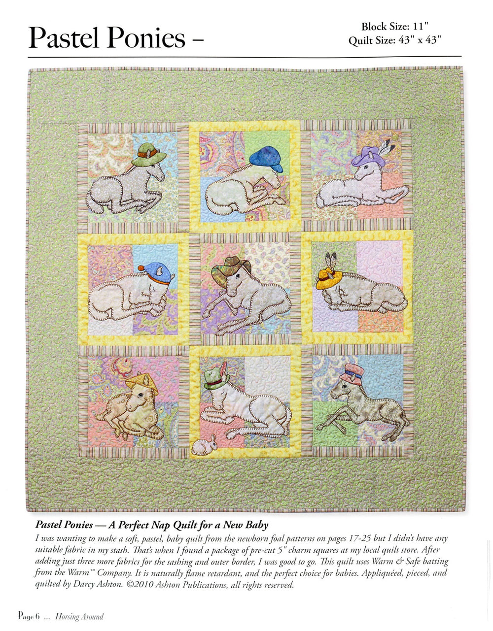 Horsing Around has twelve different quilting projects to sew from the numerous horse patterns in this book. It also has one mule pattern. The horses can be sewn as simple one piece appliques, beaded art quilts, or wool penny rugs. The quilt projects range from Asian, to pastel baby quilts.