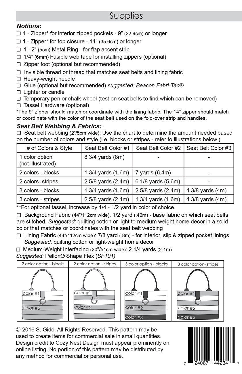 Introduce your customers to something new! Stitch up a seat belt webbing Market Tote! This kit contains pattern, seat belt webbing, and metal ring hardware - just add fabric, interfacing and zippers. Seat belt webbing is extremely durable, easy to clean, and easy to sew on a home machine.