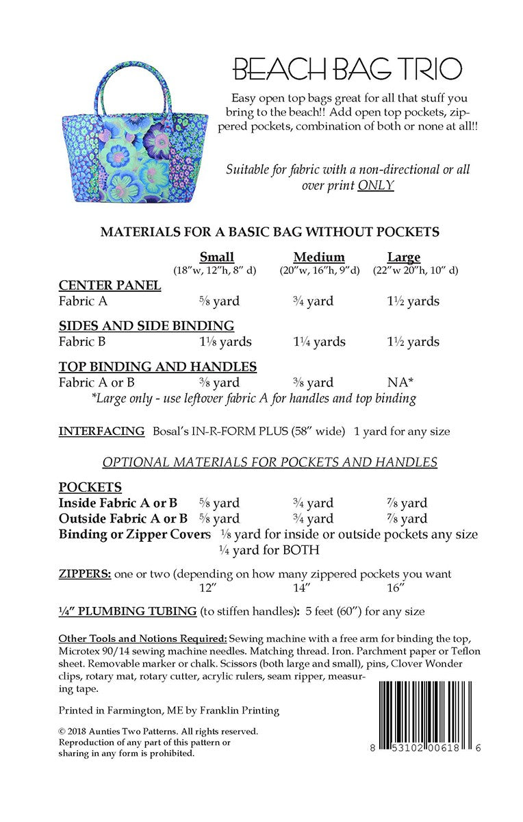 Beach Bags OR clutter catchers in three sizes with or without pockets. Small 18in wide x 12in tall x 8in deep, Med 20in wide x 16in tall x 9in deep, Large 22in wide x 20in tall x 10in deep