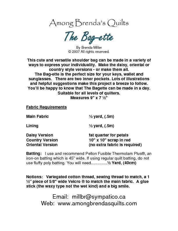 This cute and versatile shoulder bag can be made in a variety of ways to express your individuality. Make the daisy, oriental or country style versions - or make them all. The Bag-ette is the perfect size for your keys, wallet and sunglasses. There are two inner pockets. Lots of illustrations and helpful suggestions make this project a breeze to follow.