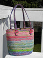 Sturdy unique tote bag with oval bottom. 12in w x 11in h Optional pocketed lining. Uses one pkg of Bali Pops and one yard of fabric (optional lining) or three to four yards of fabric.
