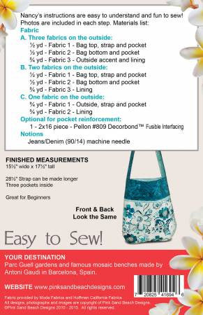 15-1/2in wide x 17-1/2in tall. 28-1/2in long strap can be made longer. Three inside pockets. No interfacing required. Fat quarter friendly. Laminate fabric friendly.