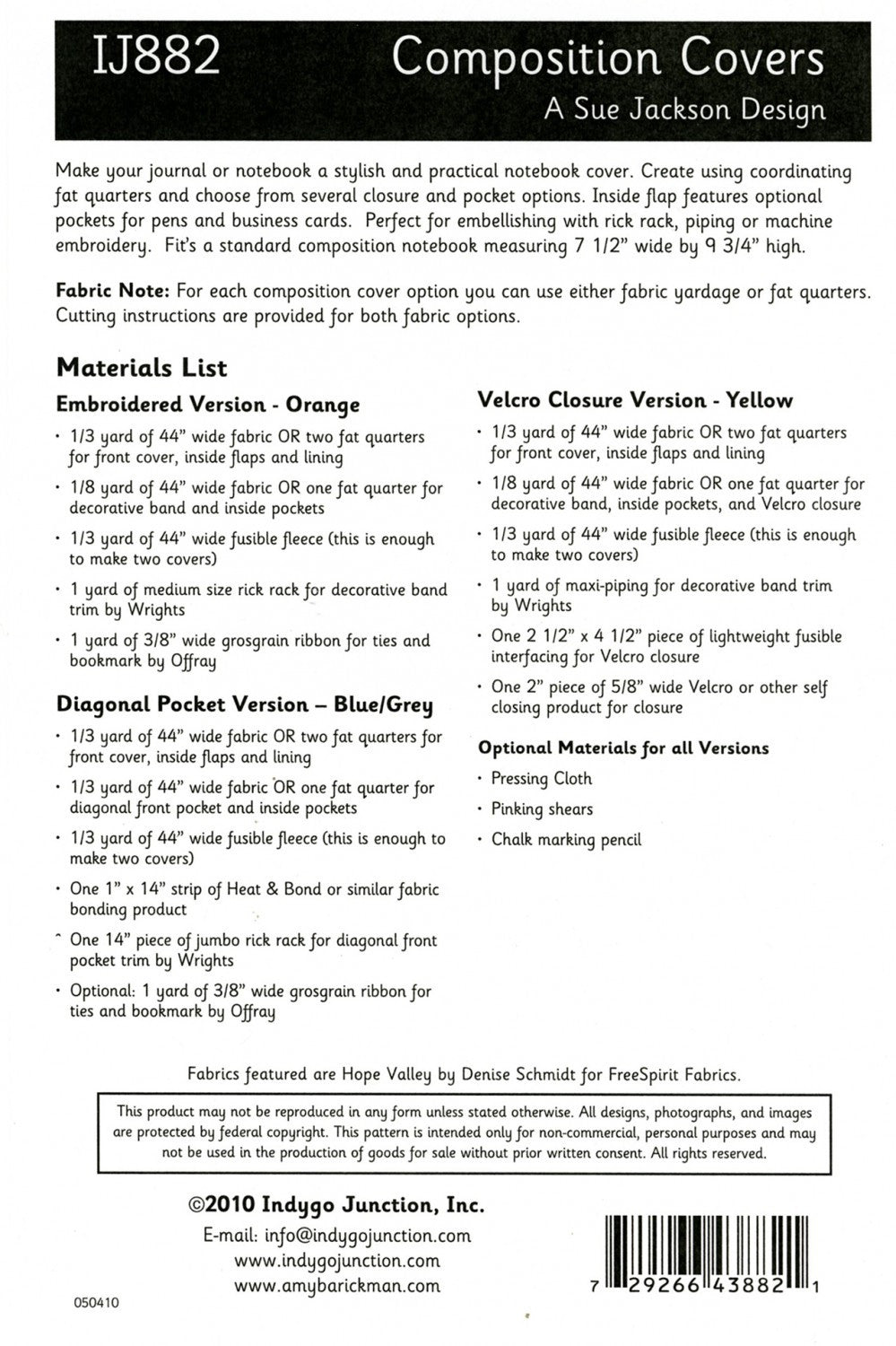 Make your journal or notebook a stylish and practical notebook cover. Create using coordinating fat quarters and choose from several closure and pocket options. Inside flap features optional pockets for pens and business cards. Perfect for rick-rack, piping or machine embroidery embellishments. Fits standard size composition notebook (9 3/4� x 7 1/2 ).