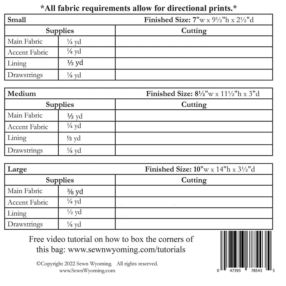 Features: Fully Lined, Flat Bottomed, Drawstring Closure, Rotary Cut (no templates)