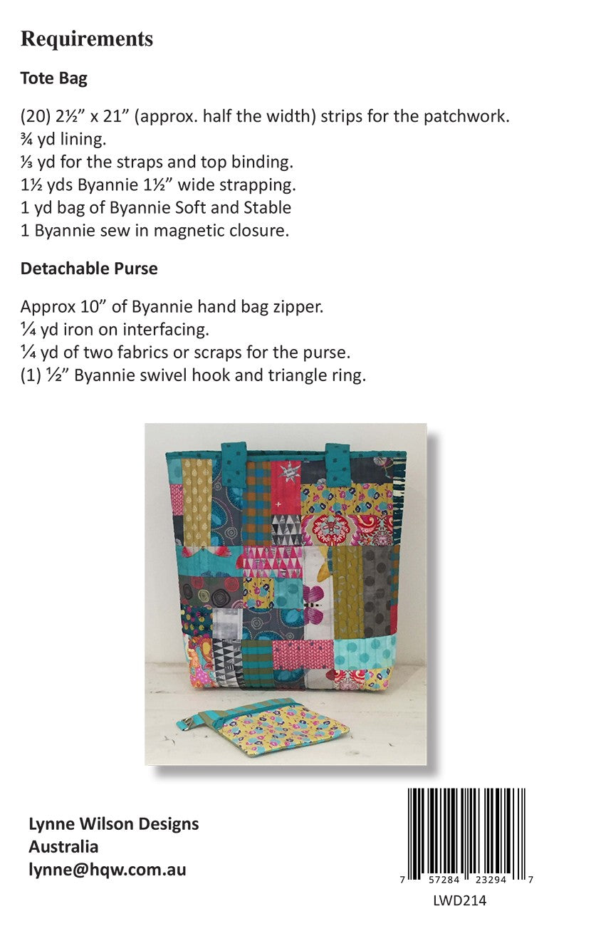 Shop in style with this handy tote bag. Got scraps from Jelly rolls? This is the perfect project for using those leftover strips.  A detachable purse to hold your keys and small items clips to the inside of the tote for easy access while you shop.