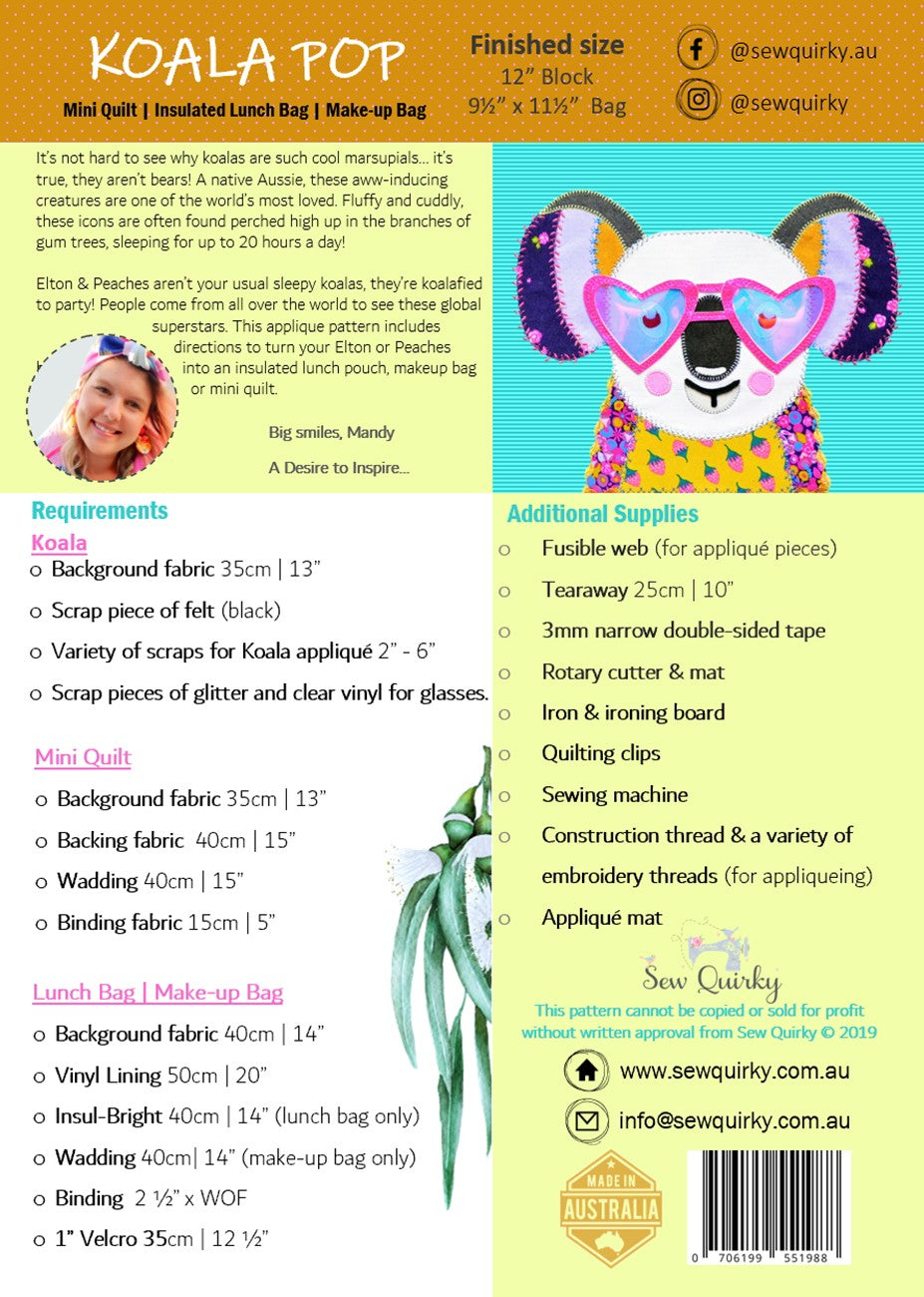 It’s not hard to see why koalas are such cool marsupials… it’s true, they aren’t bears! A native Aussie, these aww-inducing creatures are one of the world’s most loved. Fluffy and cuddly, these icons are often found perched high up in the branches of gum trees, sleeping for up to 20 hours a day! Elton & Peaches aren’t your usual sleepy koalas, they’re koalafied to party! People come from all over the world to see these global superstars. This applique pattern includes directions to turn your Elton or Peaches block into an insulated lunch pouch, makeup bag or mini quilt.