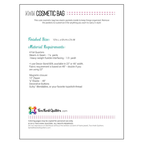 Kwik Cosmetic Bag Pattern is backordered and will ship as soon as it is back in stock.