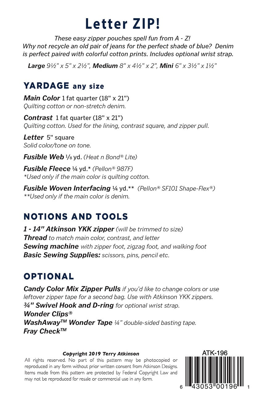 These easy zipper pouches spell fun from A - Z! Why not recycle an old pair of jeans for the perfect shade of blue? Denim is perfect paired with colorful cotton prints. Includes optional wrist straps. Finished sizes: Large 9.5" x 5" x 2.5" Medium 8" x 4.5" x 2" Mini 6" x 3.5" x 1.5"