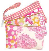 8-1/2in wide x 5-1/2in tall x 1in deep. Optional wrist strap. Fully lined. Easy to sew zipper top closure. Fat quarter friendly. Laminate fabric friendly.