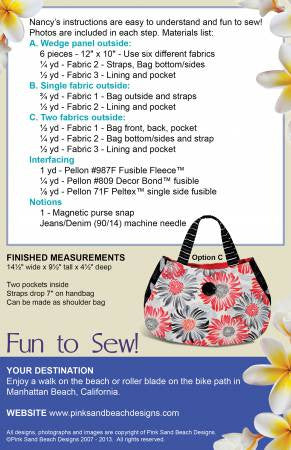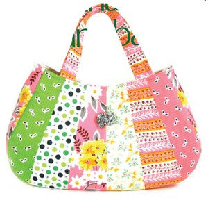 14-1/2in wide x 9-1/2in tall x 4in deep. Make it with either 6 complimentary fabrics as pictured, or with one or two outside fabrics. Has two inside pockets and an easy magnetic snap closure. Full color instructions and pictures. Very beginner friendly.