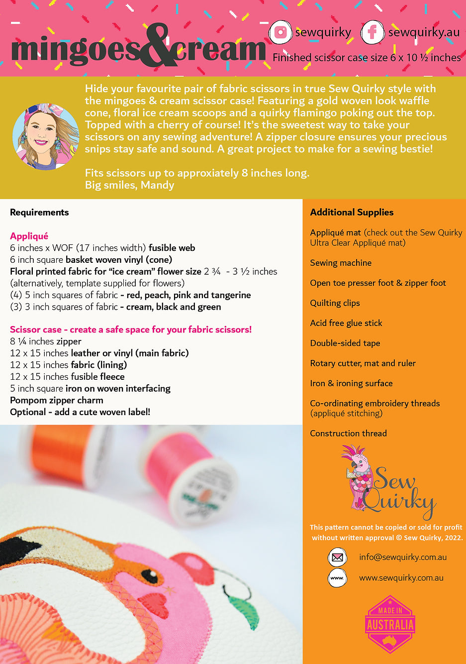 Hide your favourite pair of fabric scissors in true Sew Quirky style with the mingoes & cream scissor case! Featuring a gold woven look waffle cone, floral ice cream scoops and a quirky flamingo poking out the top. Topped with a cherry of course! It’s the sweetest way to take your scissors on any sewing adventure! A zipper closure ensures your precious snips stay safe and sound. A great project to make for a sewing bestie!