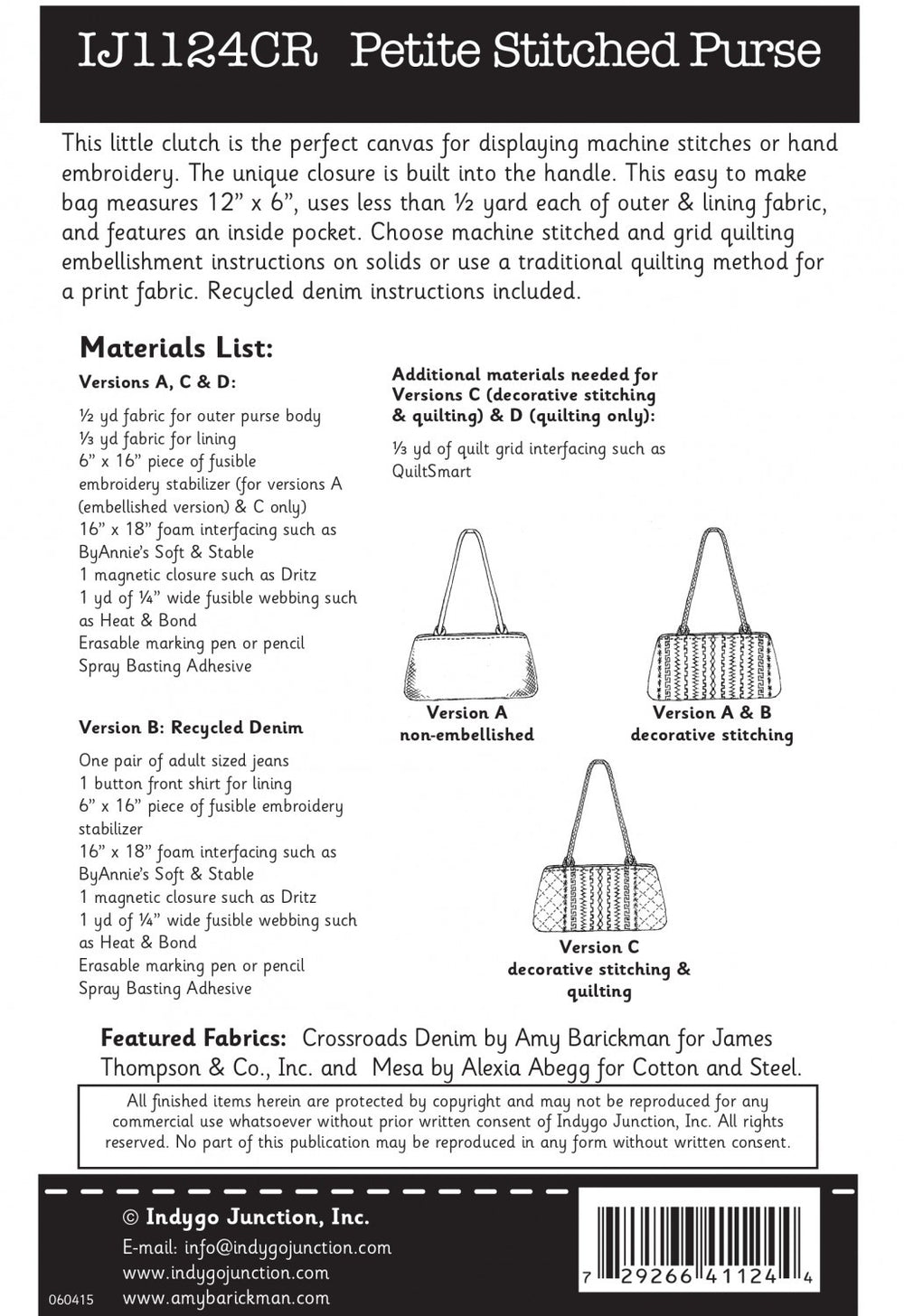 This little clutch pattern is the perfect canvas for displaying machine stitches or hand embroidery. The unique closure is built into the handle. This easy to make bag uses less than 1/2 yard each of outer & lining fabric, and features an inside pocket. Choose machine stitched and grid quilting embellishment instructions on solids or use a traditional quilting method for a print fabric. Recycled denim instructions included.