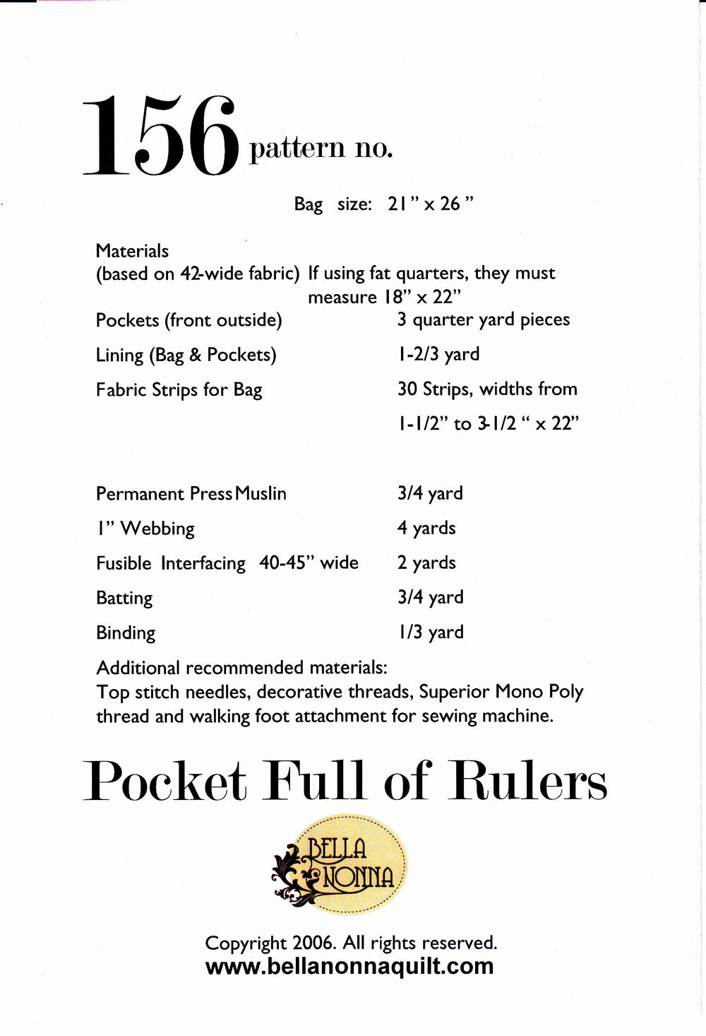 This bag holds rulers inside with custom pockets to fit all your specialty rulers. Three outside pockets hold 6� wide rulers of various lengths. The Pocket Full of Rulers bag was designed by a quilting instructor, Jerrine Kirsch for Bella Nonna and has been a hit with the quilting world! A great way to show off those decorative stitches on your machine.
