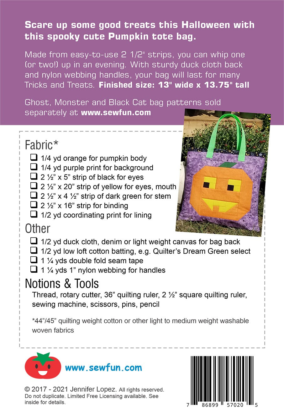 Scare up some good treats this Halloween with this spooky cute Pumpkin tote bag. de from easy-to-use 2.5in strips, you can whip one (or two!) up in an evening. With sturdy duck cloth back and nylon webbing handles, your bag will last for many Tricks and Treats. Finished size: 13in wide x 13.75in tall
