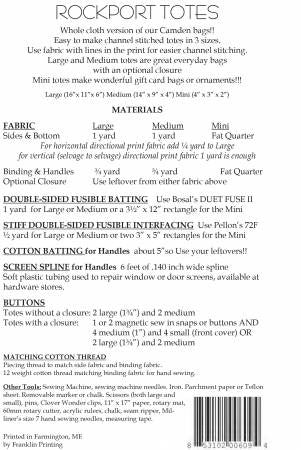 The Rockport Totes Pattern by Aunties Two has clear directions to make channel stitches totes in 3 sizes! Instructions are included to pick out the perfect fabric for easier stitching and each bag has double handles. Finished sizes are as follows:  Large (16�x 11�x 6�) Medium (14� x 9� x 4�) Mini (4� x 3� x 2�).