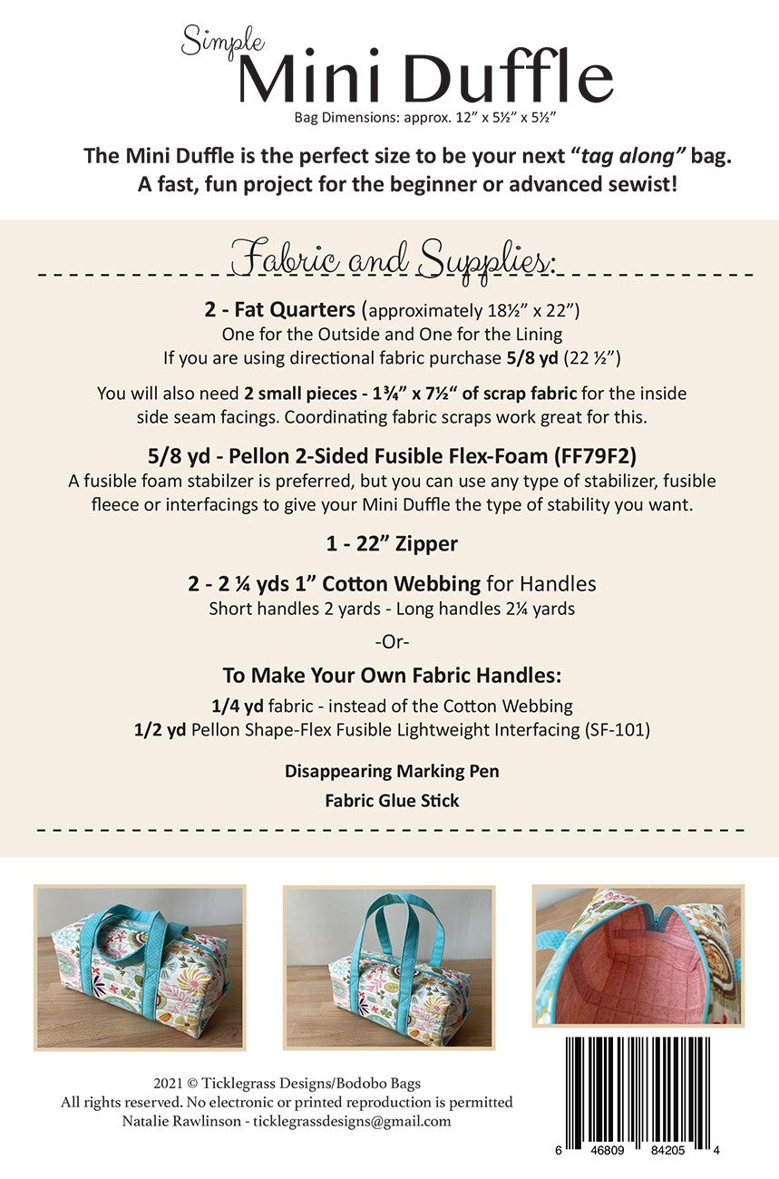Simple Mini Duffle Pattern is backordered and will ship as soon as it is back in stock.