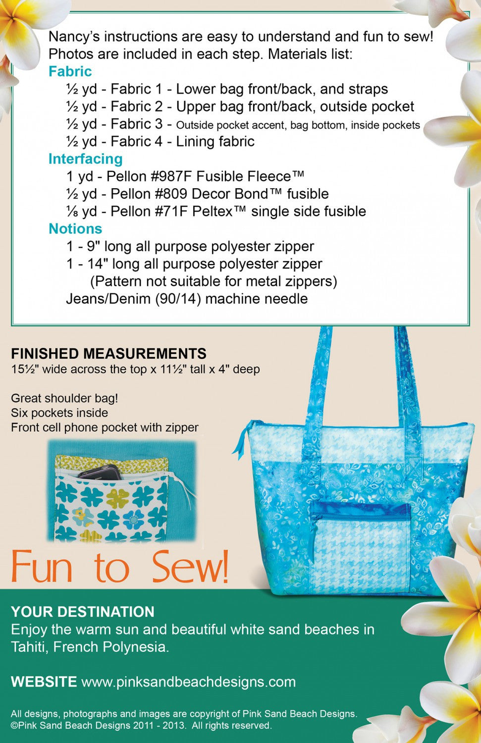 15-1/2in wide x 11-1/2in tall x 4in deep. Front pocket with zipper and six inside pockets. Fully lined. Easy zipper closure. Full color instructions with pictures. Laminate fabric friendly.