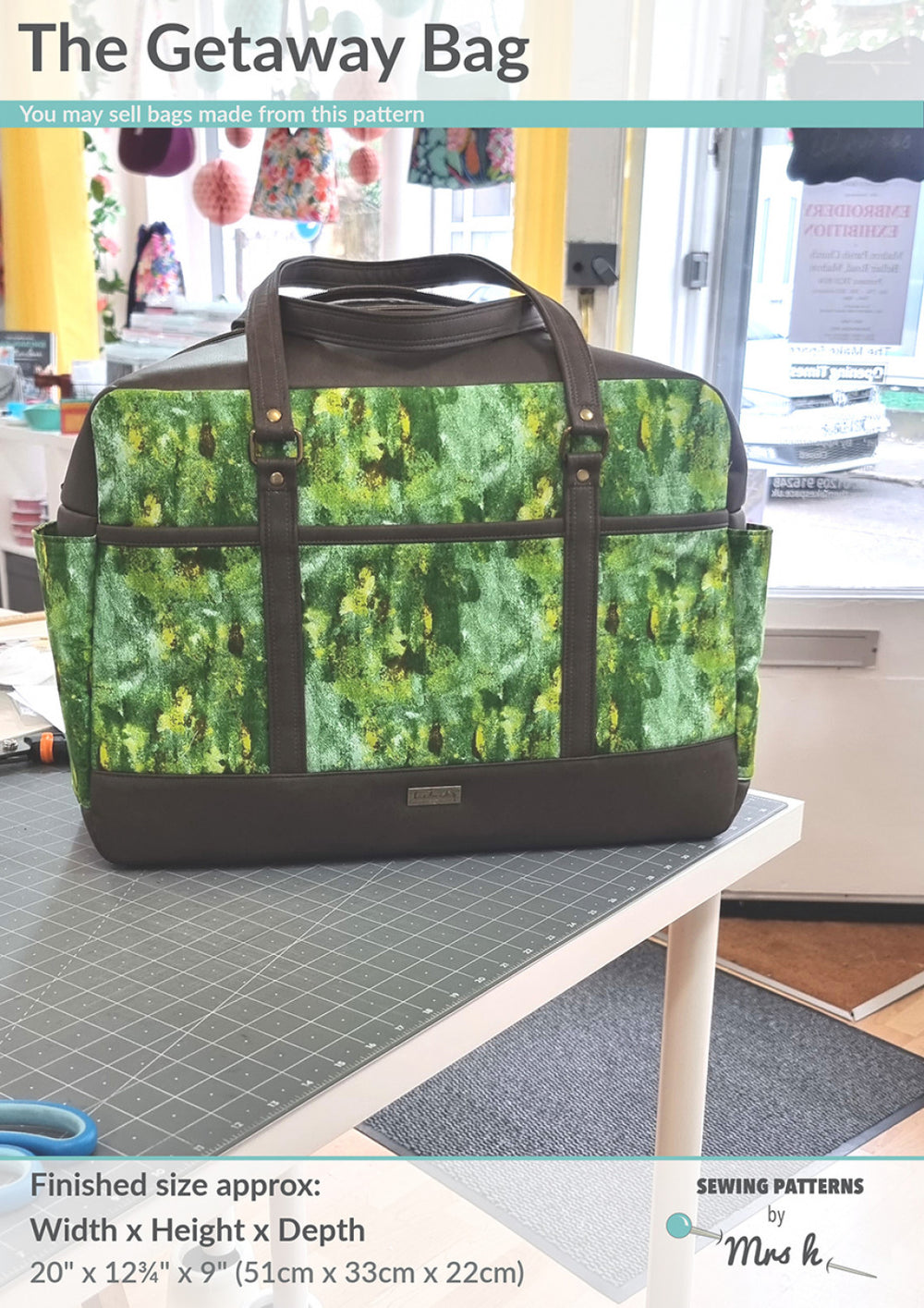The Getaway Bag is your perfect getaway companion! With elasticated pockets inside, exterior end pockets, luggage strap/passport pocket combo, sturdy handles and a rigid base, you're ready for your next adventure! It is an advanced level sewing pattern. The Getaway Bag has finished dimensions of 20" wide x 12 3/4" height x 9" depth (51cm x 33cm x 22cm)