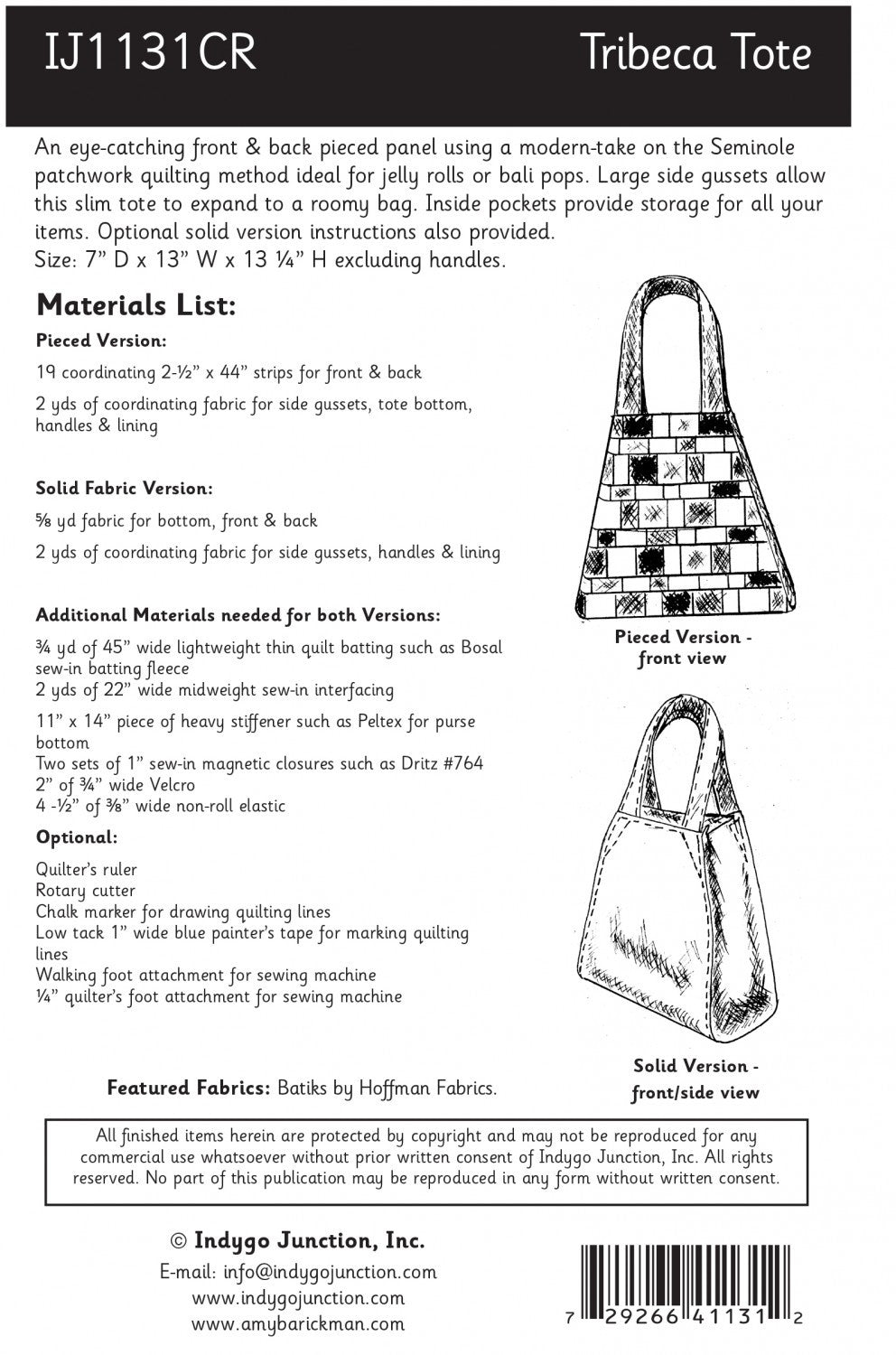The Tribeca Tote features an eye-catching front & back pieced panel using a modern-take on the Seminole patchwork quilting method ideal for using jelly rolls or bali pops. Large side gussets allow this slim tote to expand to a roomy bag. Inside pockets provide storage for all your items. Optional solid version instructions also provided Size: 7in D x 13in W (bottom edge) 8in W (top edge) x 13-1/4in H excluding handles. Top gusset width when opened: 14in.