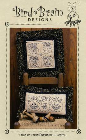 Embroidered BlackWork Pumpkin perfect for Halloween. Get ready for Trick or Treat Parties and Decorate your Home with FUN Designs. Make a couple of pillows for favorite chairs or greet all those Trick or Treaters at the door with a Halloween Pumpkin wall hanging or two. The 4 pumpkins embroidery measures 8 1/2" x 8 1/2". The Trick or Treat Pumpkins embroidery measures 6" x 12".