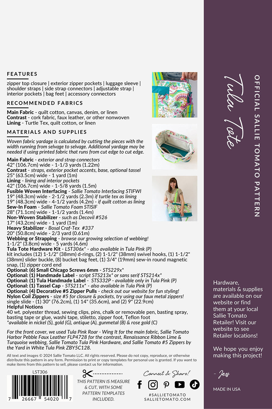 A spacious tote with multiple pockets, luggage sleeve, and d-rings for clip-on accessories by Sallie Tomato with Tula Pink. Imagine all that you could pack into the Tula Tote: an assortment of projects for a retreat, or everything you might need for a day-trip. This ultimate carry-all includes various pockets for storage, luggage handle sleeve, and plenty of d-rings for clip-on accessories to optimize your organizing! This pattern can be accessorized with LST307 Tula Accessories Pattern!