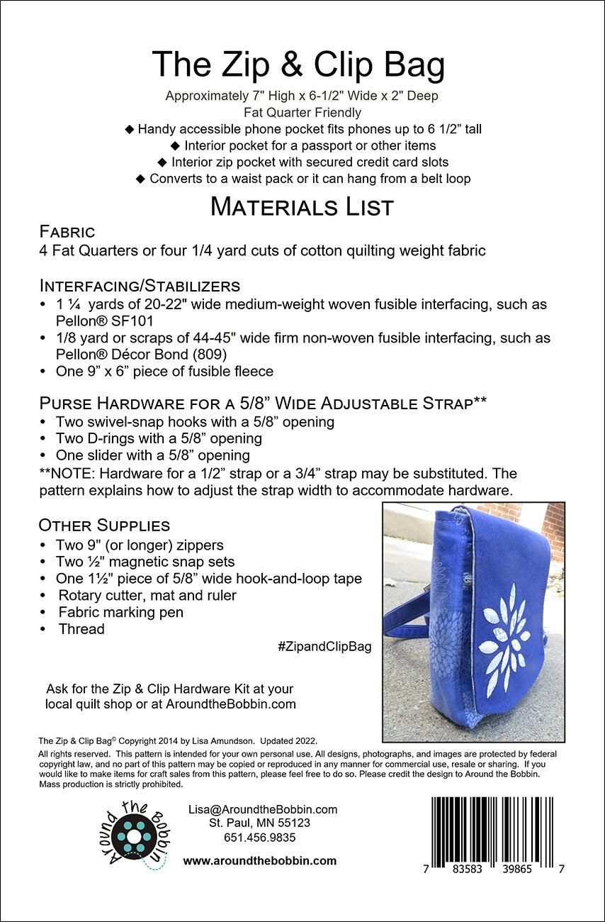 Safe and secure for travel or hands-free outings around town, the Zip and Clip Bag can be worn as a cross-body bag or converted to a waist bag. Fat quarter friendly!