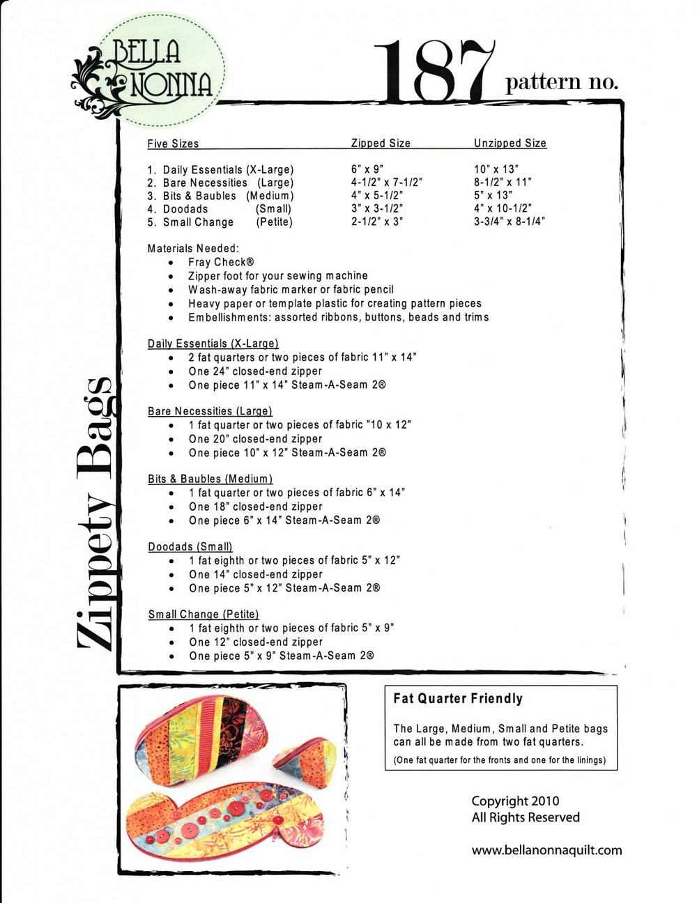 5 full-size zippety bag pattern pieces included in this pattern.