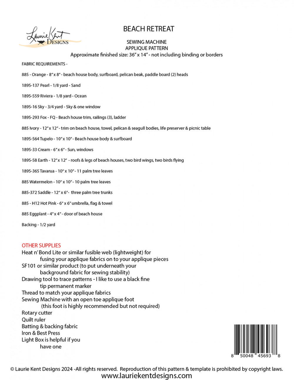 Beach Retreat Sewing Applique Pattern by Laurie Kent Designs is backordered and will ship as soon as it is back in stock.